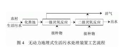 11、无动力地埋式生活污水处理装置:生活污水首先进入厌氧消化池,污水中的悬浮物沉降下来成为污泥,污泥通过一定时间的自然发酵,有机物得到降解。工艺流程见图4。出水水质稳定达到国家二级排放标准。